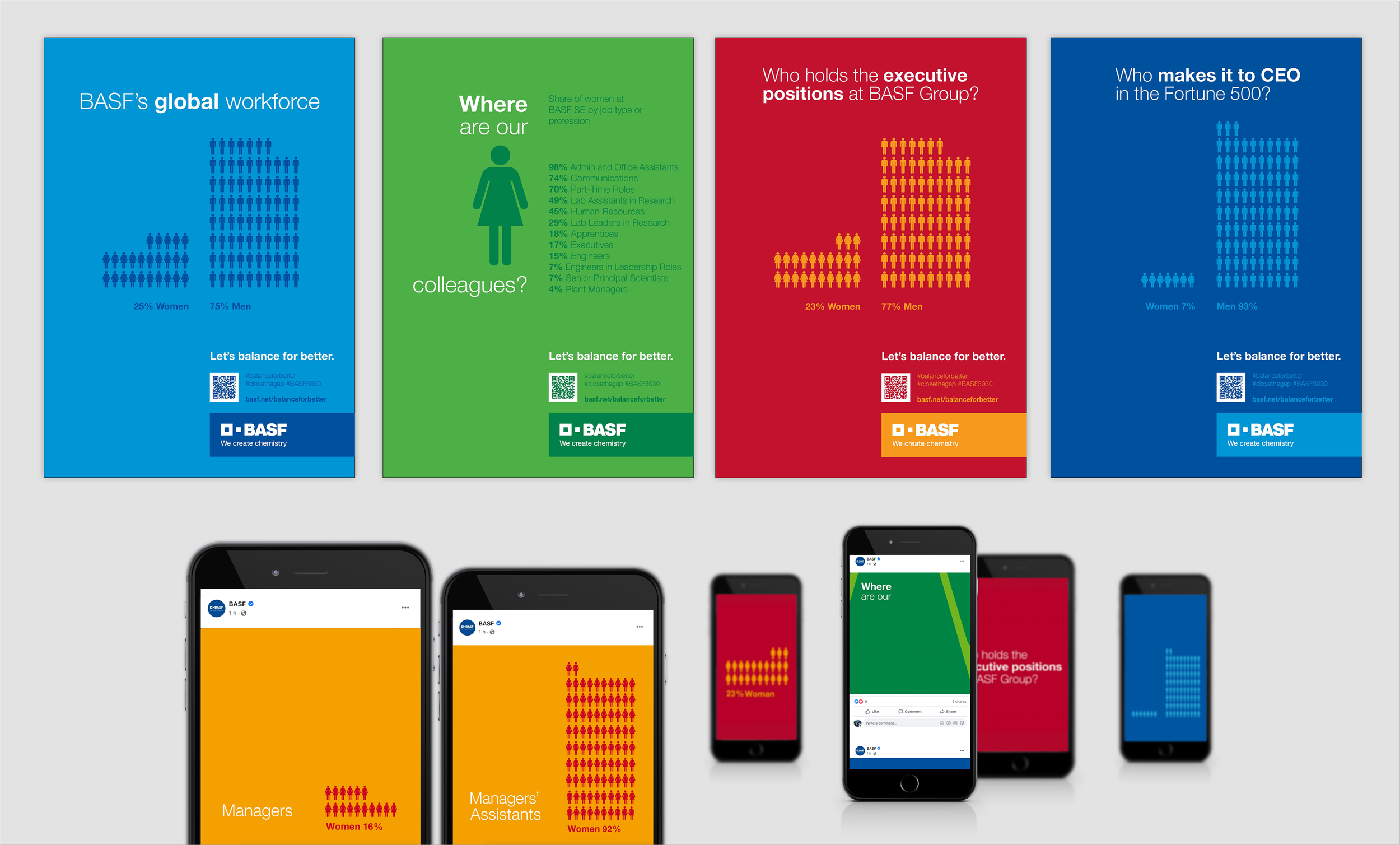 Balance for Better unmistakably lays out the evidence with elegant design that grabs attention and proves its point in seconds. The posters were displayed throughout BASF offices worldwide and shared through their intranet. Our entire creative team was female identifying, and the final idea took inspiration from a legendary piece of work by feminist art group Guerrilla Girls.