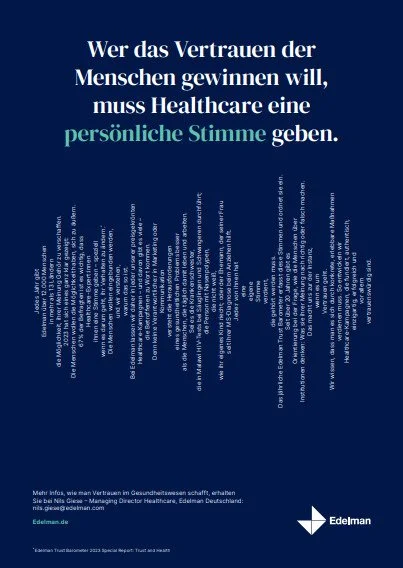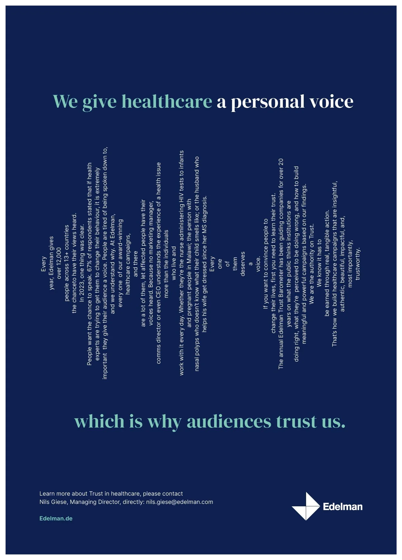 Edelman’s brand is trust. In healthcare communications, that aspect is even more critical. We need to give patients and healthcare professionals a voice, spread awareness, and accurately convey the realities of countless illnesses and their impact.